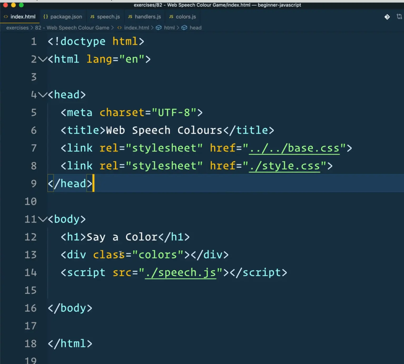 If you open up the 84 - Web Speech Colour Game folder within the exercises directory, lets take a look at what we are working with.