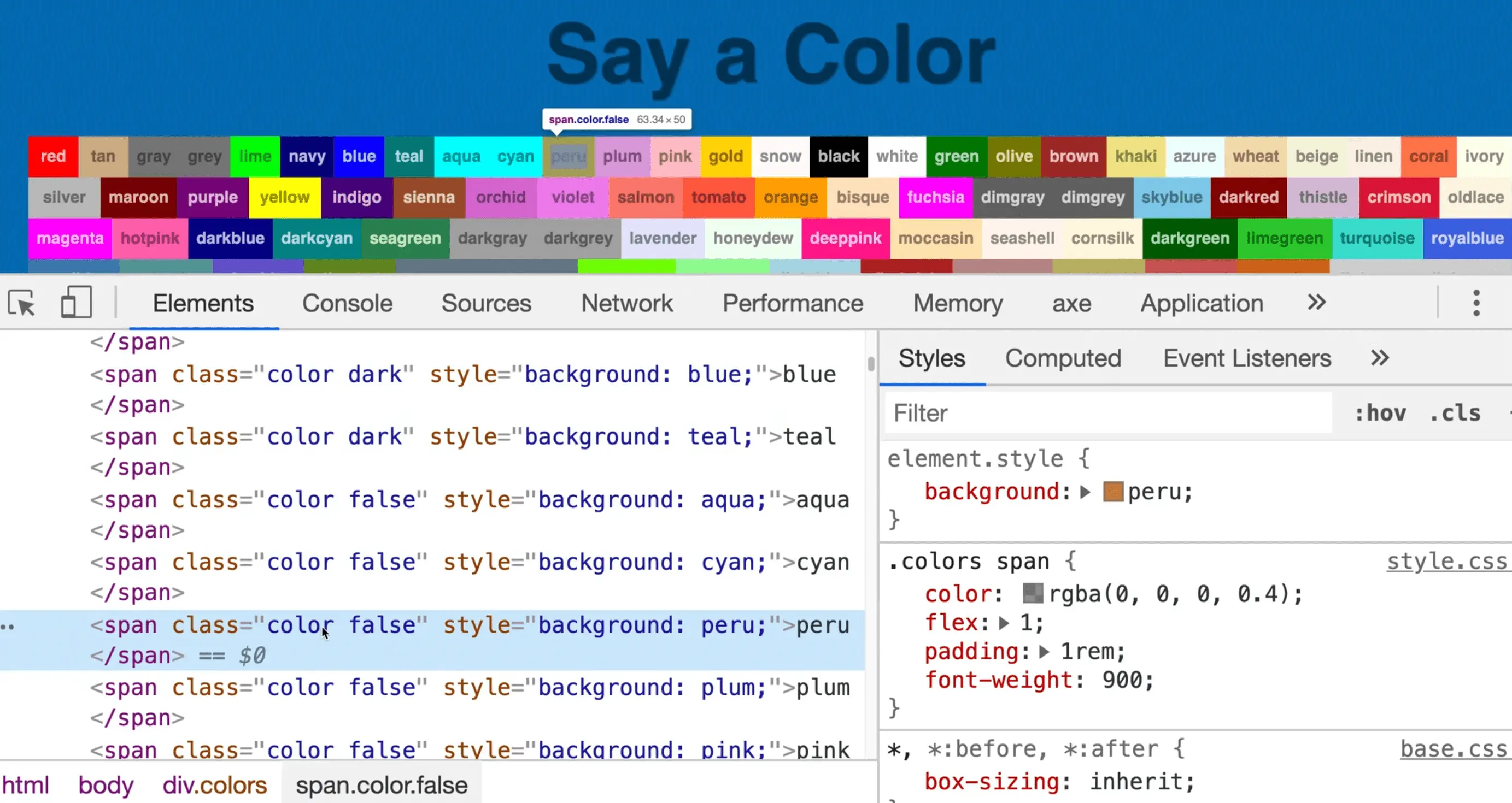 However, we have run into an issue. We need a way to select a specific span and as you can see above, there is no way to identify the correct span. Let's fix that to add the color's name as a class in addition to the color class.