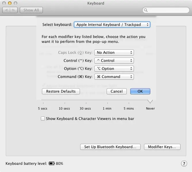 First thing you'll need to do is open System Preferences → Keyboard → Then click the Modifier Keys button in the lower right.
